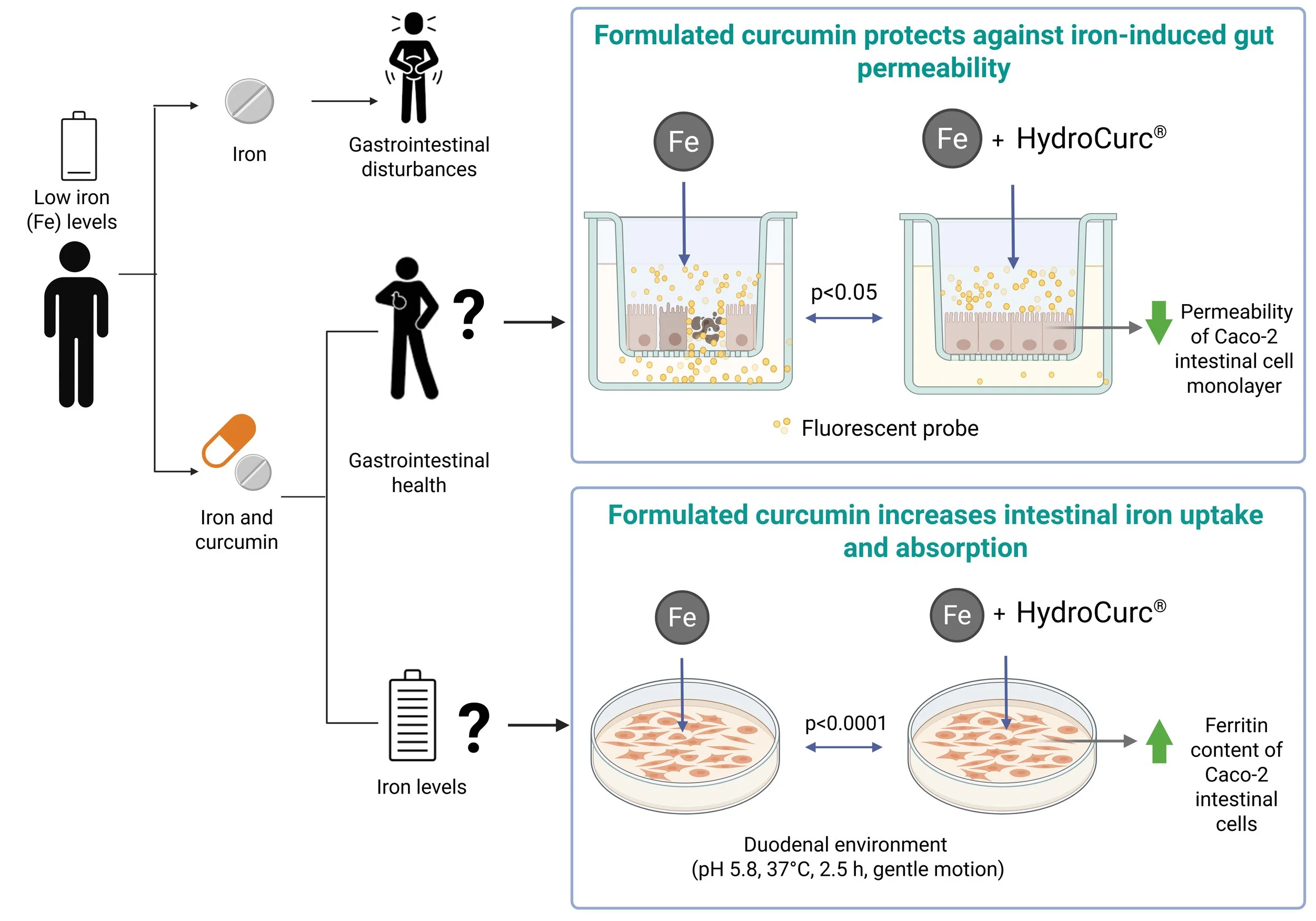 This study investigated how HydroCurc® interacts with iron and affects intestinal absorption and health, significantly increasing ferritin levels by 160.5%, enhanced iron reduction, and protected intestinal barrier integrity.