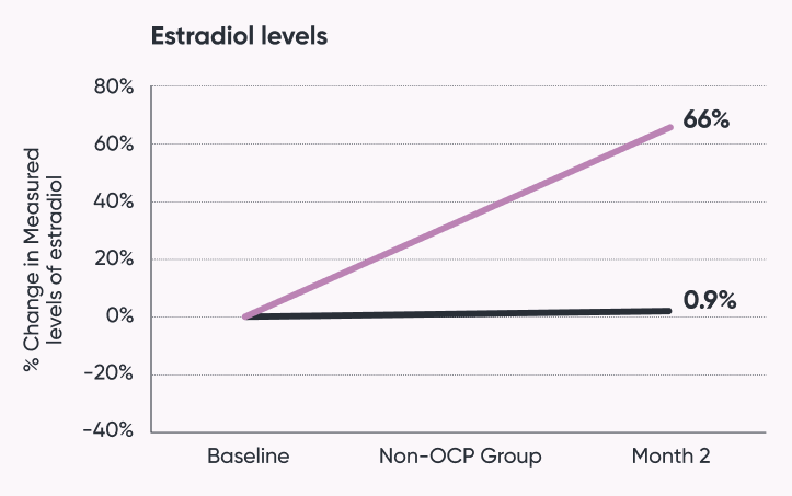 Line graph showing estradiol levels over time, with baseline, non-OCP group, and month 2, indicating a 66% increase in estradiol levels at month 2.